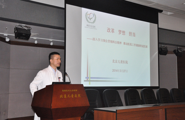 培训会上,丁枭伟副书记做了题为《改革 梦想 担当——深入学习领会贯彻两会精神 推动医院工作健康快速发展》的报告。报告分别从2014年两会基本情况、政府工作报告、政协工作报告三个方面对两会精神进行解读,深入浅出,全面分析了两会内容。特别针对报告中关于医改内容进行详细解读,使广大积极分子对国家的大政方针以及今后我院工作方向有了深刻的认识。