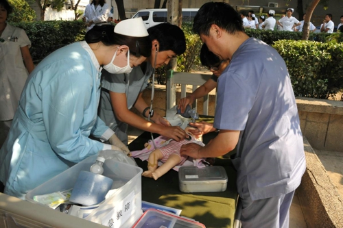 7月25日下午,路过儿童医院西门的家长都在紧张地观看这一幕。其实,这是北京儿童医院开展的一次消防应急演练。医疗、护理、保卫、后勤、管理等方面的应急能力都要在这次演练中得到检验。