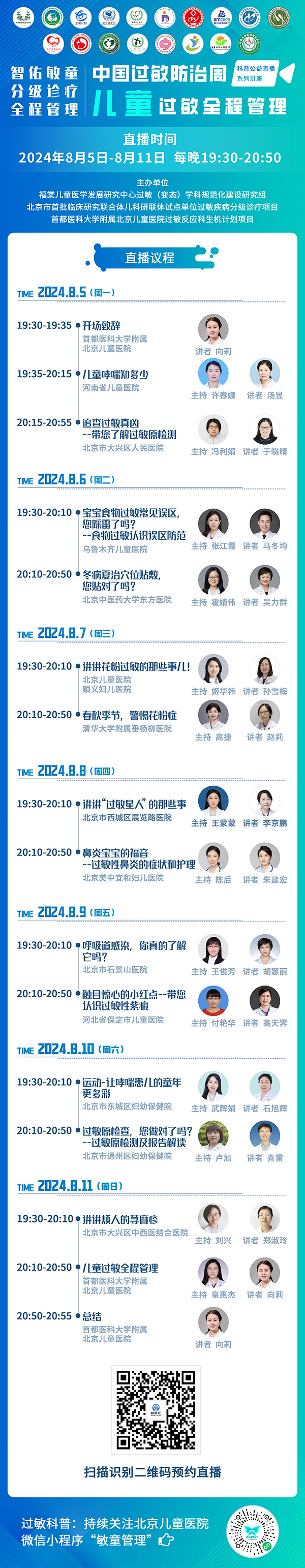 2024年8月5日至11日是我国第九个“中国过敏防治周”。在此期间,为积极响应2024年度过敏周主题“发展过敏专科,培养专科人才,深入基层医院,惠及过敏患者”,首都医科大学附属北京儿童医院过敏反应科联合全国共35家各级医疗机构包括基层社区卫生服务中心的儿科同行,举办“2024中国过敏防治周-儿童过敏全程管理”活动,以实际行动践行“对过敏患儿进行规范治疗管理和预防教育,对公众做好过敏宣传科普,对专科人才抓好梯队建设,对过敏学科持续做好建设和发展”。