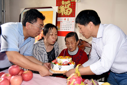 来到老人住处,市局领导与院领导为老人送上寿匾、鲜花、生日蛋糕和慰问金。他们拉着老人的手,亲切问候老人,并详细询问老人的衣食起居,嘱咐老人要好好休息,多多保重身体。林教授对大家的到来感到非常高兴,一面表达感谢,一面连说让大家一起吃蛋糕。伴随着“生日歌”,大家吹蜡烛、切蛋糕,为老人送上长寿的祝福。临行前,大家还与林教授合影留念。