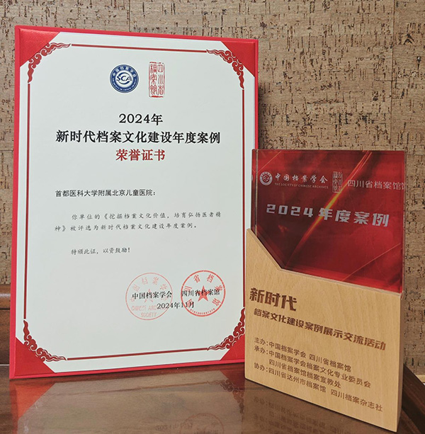 2024年11月21-23日,由中国档案学会、四川省档案馆主办的新时代档案文化建设案例现场展示交流活动在四川达州举行。北京儿童医院报送的《挖掘档案文化价值,培育弘扬医者精神》从全国数百个参选案例中脱颖而出,成为年度优秀案例之一,获大会表彰。