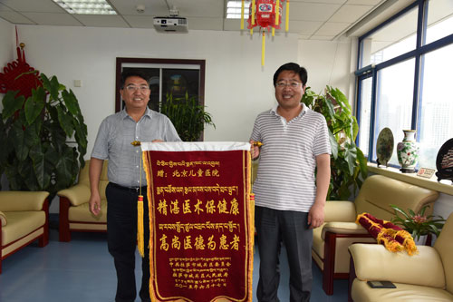 7月10日上午,拉萨市城关区区委副书记、区长刘亮一行4人来我院赠送锦旗,对我院医疗队5月29日到6月4日在“爱目行动”中到拉萨市人民医院及城关区海淀小学开展的视力筛查及义诊表达了感谢。我院党委书记王天有、眼科主任李莉及北京儿童医院集团新医疗发展中心副主任杨少鹏分别代表医院、相关专家和集团接受了锦旗。