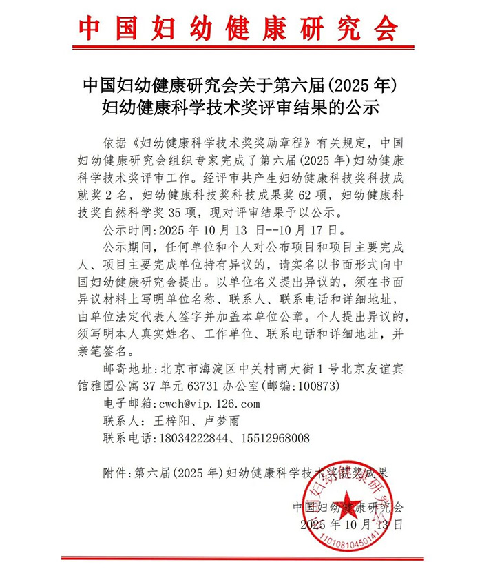 王焕民团队荣获2025年度中国妇幼健康研究会妇幼健康科学技术奖三等奖