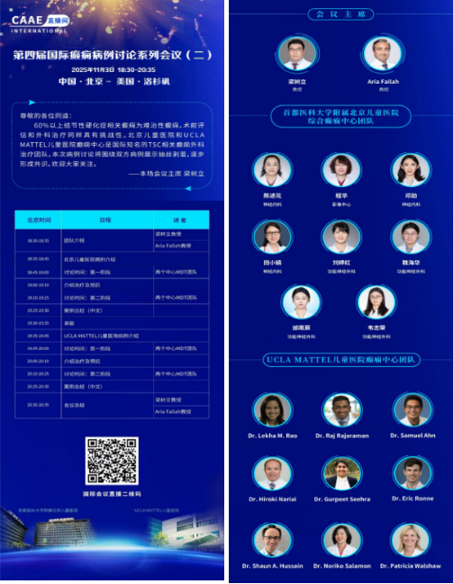11月3日晚,中国抗癫痫协会第四届国际癫痫病例讨论系列会议第二场线上召开。本次会议特邀美国加州大学洛杉矶分校(UCLA)Mattel儿童医院癫痫中心团队与首都医科大学附属北京儿童医院综合癫痫中心团队深度对话,围绕复杂儿童癫痫病例展开层层剖析,既为全球癫痫领域同道呈现了高水平诊疗思辨讨论,更延续并深化了中美双方在儿科癫痫领域的长期协作,为后续联合推动行业发展奠定坚实基础。