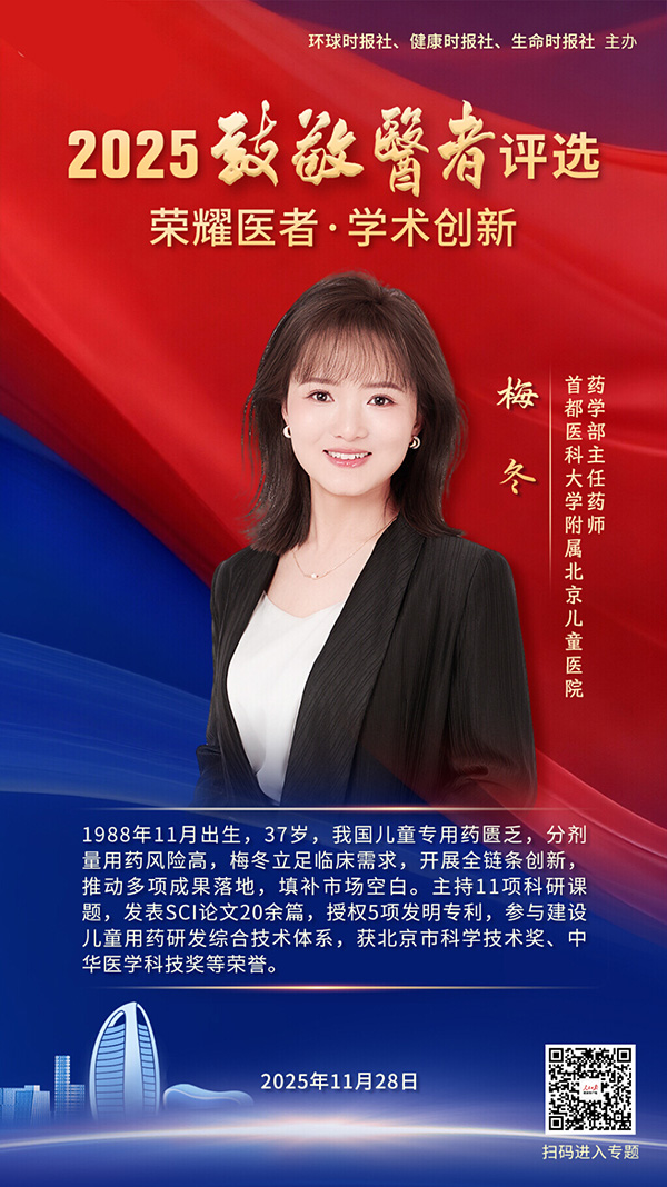 从实验室到临床一线,从科研攻关到成果转化,梅冬用坚守与创新诠释着医者担当。她先后获得中华医学科技奖、全国卫生健康行业青年创新大赛金奖等荣誉,入选北京市科技新星计划。“孩子的健康是最大的动力”,梅冬用专业与温暖,为儿童用药安全筑牢防线。