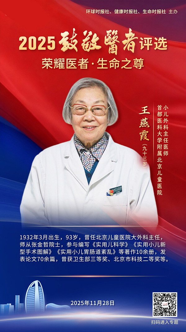 王燕霞,1932年3月出生,93岁,首都医科大学附属北京儿童医院小儿外科主任医师,师从张金哲院士。参与编写《实用儿科学》《实用小儿新型手术图解》《实用小儿胃肠道紊乱》等著作10余册,发表论文70余篇。曾获卫生部三等奖一项、北京市科技二等奖两项等。