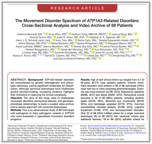 近日,国家儿童医学中心北京儿童医院携手美国波士顿儿童医院,联合欧美11家顶级医疗中心,完成全球大规模ATP1A3相关疾病临床研究。相关成果以“The Movement Disorder Spectrum of ATP1A3-Related Disorders: Cross-Sectional Analysis and Video Archive of 88 Patients(ATP1A3相关疾病的运动障碍谱系:88例患者的横断面分析及视频资料库)”为题,发表于国际运动障碍领域权威期刊Movement Disorders。该研究是中美儿童神经领域国际合作的重要成果,为疑难罕见遗传病的诊疗提供了新框架。波士顿儿童医院Katerina Bernardi、北京儿童医院神经内科主治医师周安娜为共同第一作者,波士顿儿童医院Darius Ebrahimi-Fakhari教授,北京儿童医院神经内科主任医师丁昌红、代丽芳为共同通讯作者。