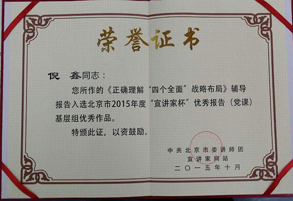倪鑫院长荣获2015年度“宣讲家杯”优秀报告荣誉称号