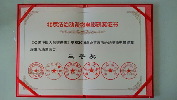 近日,2016年北京市法治宣传教育领导小组办公室等单位联合开展的以“尊法学法守法用法”为主题的2016年《北京市法治动漫微电影作品征集展映》活动揭晓,北京儿童医院检验中心张海洋同志的作品《仁者神医大战键盘侠》荣获漫画类“三等奖”、北京儿童医院荣获“组织奖”,为医院赢得了荣誉。