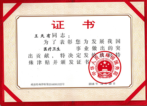 因王天有教授在儿内科领域取得的优异成绩及突出贡献,经过严格选拔与评审,最终荣获“2016年度国务院政府特殊津贴专家”称号。