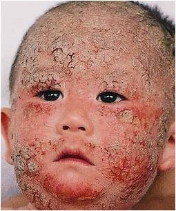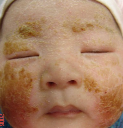 (1)婴儿期(生后-2岁):多发于出生40天以后的婴幼儿,少数可于满月内发病。皮损好发于头皮、面部、肢体伸侧及耳廓处,可表现为丘疹、丘疱疹、水疱、皲裂、渗液和结痂。至2岁时,80%左右的患儿基本痊愈,未愈者进入儿童期(图1-2)。