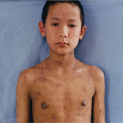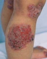 (2) 儿童期(2-12岁):可由婴儿期演变而来,亦有不经过婴儿期而发病。皮损多表现为针尖大丘疹、丘疱疹和小水疱,融合成片,较干燥,被覆灰白色鳞屑,伴浸润及部分苔藓化,多发生于肘窝、腘窝和四肢伸侧(图3)。
