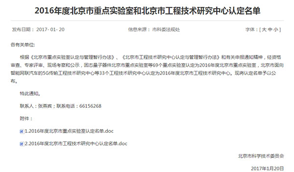 根据《北京市重点实验室认定与管理暂行办法》和有关申报通知精神,经北京市科学技术委员会资格审查、专家评审、现场考察和公示,北京儿童医院出生缺陷遗传学研究北京市重点实验室被认定为2016年度北京市重点实验室,负责人为李巍教授。至此,北京儿童医院经北京市科委认定的北京市重点实验室和北京市工程技术研究中心总数已增加至6个。