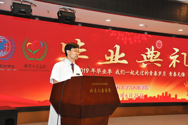 最后,儿科医学院院长倪鑫教授为毕业生同学们送上寄语,对辛苦培养同学们的老师、家长表示感谢,期望同学们继续传承儿童医院的“公慈勤和”院训精神,永怀医者大爱,在未来的岗位和学习工作中彰显国家儿童医学中心的工作态度,体现出首都医科大学儿科学系的工作定力,不断学习,学到老,活到老,时刻要牢记儿科医师的责任,发展儿科医学,为祖国儿童健康撑起一片蓝天