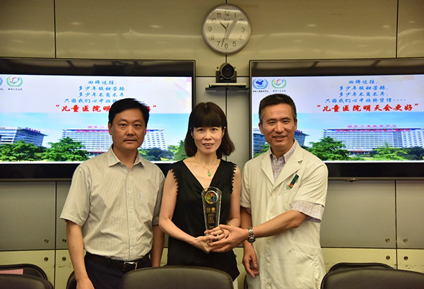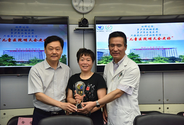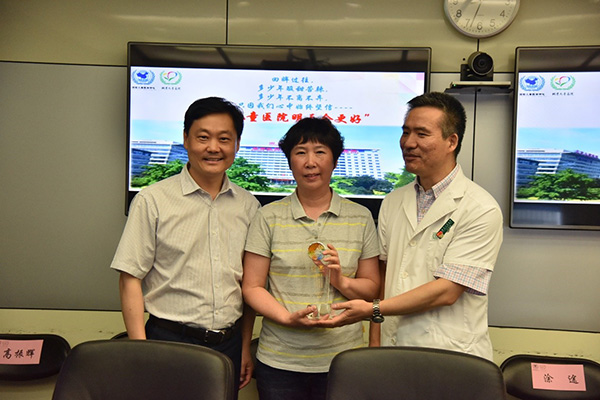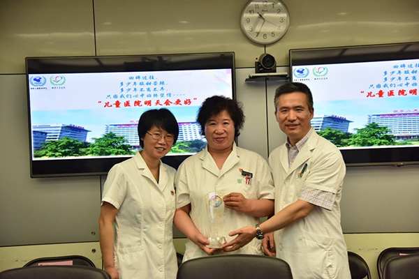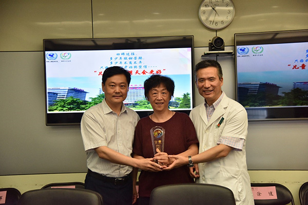 随后由丁枭伟书记、谢向辉副院长及王爱华主席为14名到龄退休职工分别颁发了带有北京儿童医院院标、院训及对退休职工美好祝福的纪念奖杯。