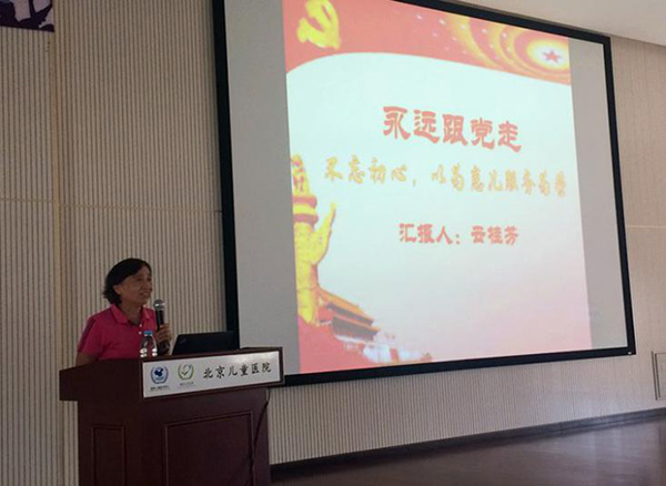 云桂芳同志以《不忘初心 以为患儿服务为荣》为题,结合自己35载的从医经历,绘声绘色地分享了医务工作中的艰辛与幸福,用自己的实际经历告诉大家如何做一名优秀的医务工作者。云桂芳同志是北京儿童医院第一位“洗肠护士”,常年与粪便打交道,不怕脏、不怕臭,用辛勤汗水书写着平凡,用无私奉献追求着卓越,得到了患者家长、组织上和社会的认可。