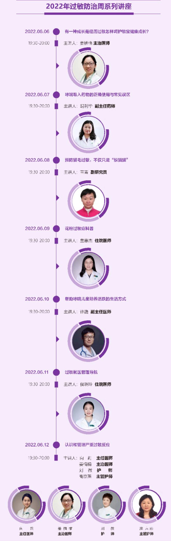 过敏反应科医护药科普创新团队,在世界过敏防治周进行了《有一种成长是经历过敏 怎样呵护敏宝健康成长?》《哮喘吸入药物的正确使用与常见误区》《预防猫毛过敏,不仅只是“躲猫猫”》《花粉过敏症诊断和治疗》《帮助哮喘儿童培养活跃的生活方式》《过敏就医管理导航》《认识和管理严重过敏反应》七场线上讲座,用通俗易懂的语言,以较高的专业水准,为广大哮喘儿童家庭送上了系列科普健康教育讲座。